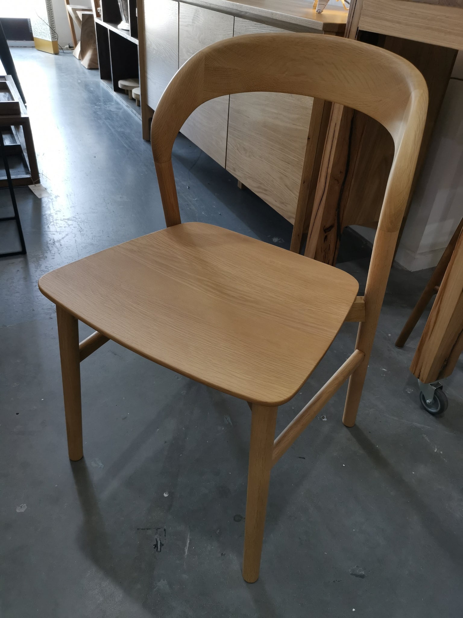 A solid oak backrest wraps around to create a comfortable dining chair. Available in natural and black oak with an upholstered seating option.