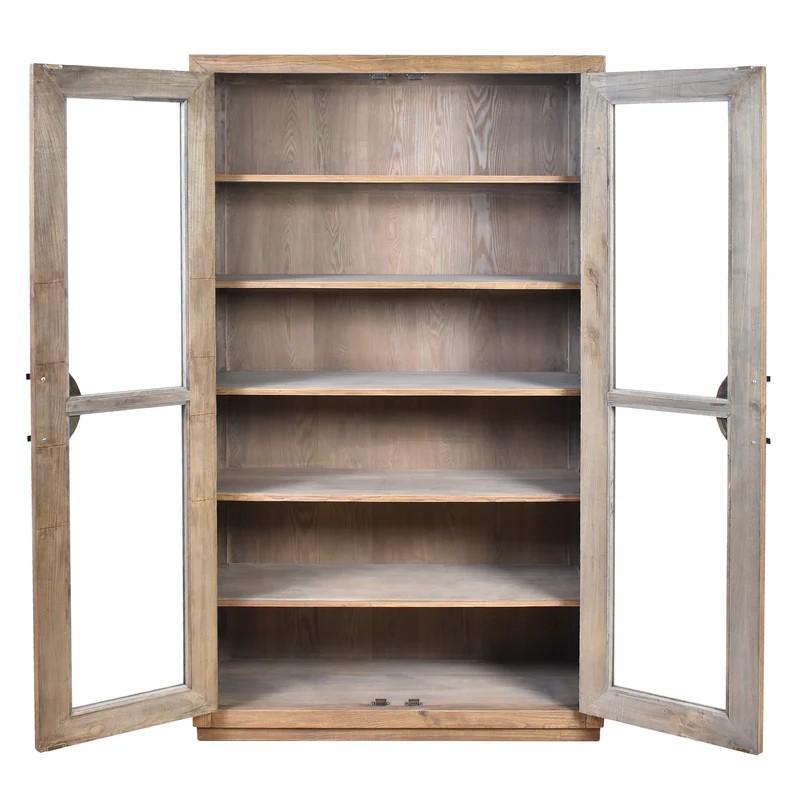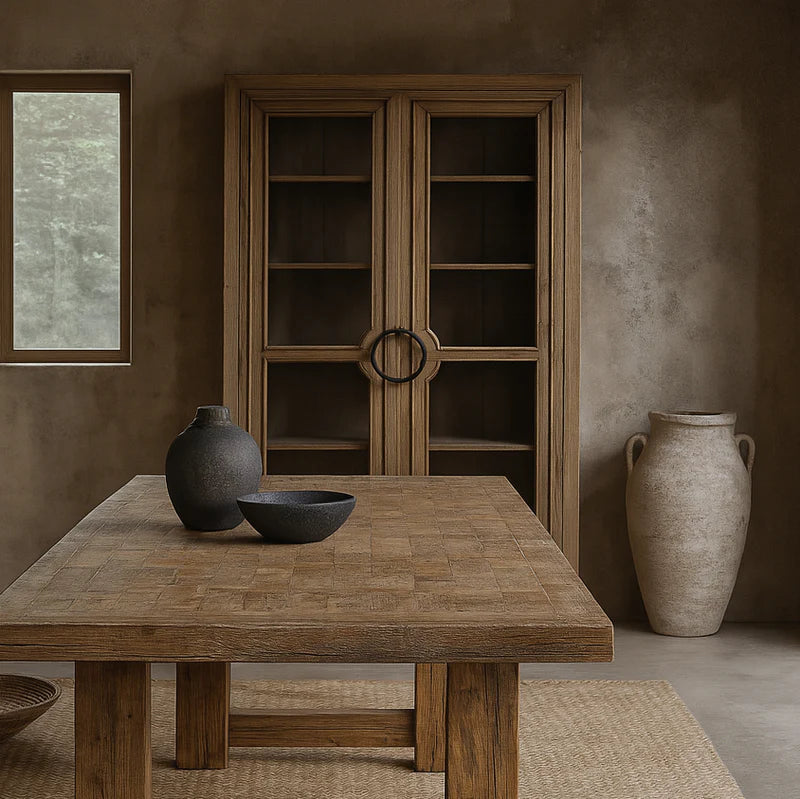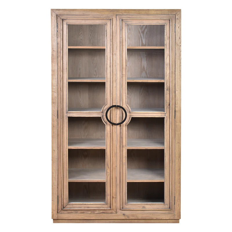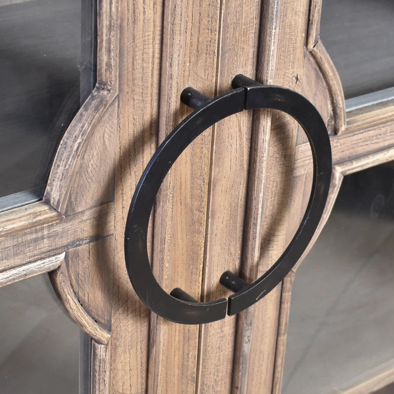 The Heirloom 2 Door Cabinet is a timeless storage piece crafted from recycled oak timber, showcasing the natural grain and rich patina of aged wood. Its tall silhouette features framed glass-panel doors with distinctive circular iron handles, offering both visibility and protection for your stored items. Inside, generous shelving provides ample space for books, ceramics, or curated décor. The warm, weathered finish and clean lines lend it a refined yet rustic charm, making it a versatile addition to traditional, French-inspired, or contemporary interiors.